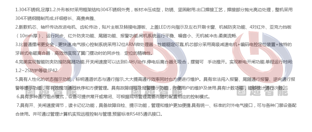 整個道閘外形采用SUS304不銹鋼板沖壓成型,智能擺閘能方便兼容IC卡、ID卡、條碼卡、指紋等讀卡識別設備的使用,為出入人員提供文明、有序的通行方式,有效管理人員進出。對通道實現智能化管理的場合。分為:單機芯:用于單通道和多通道;雙機芯:用于多通道。
